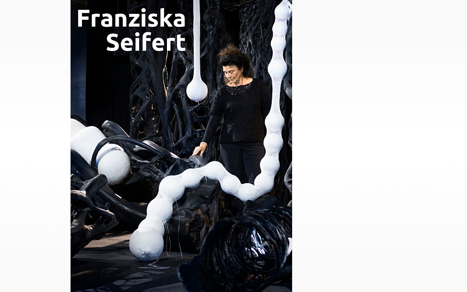 Materialien aus fernen und nahen Welten – wie Würgefeigen, Bambus, Rindentuch, Sandstein oder Organza – treffen auf ungewohnte Art und Perspektive aufeinander.